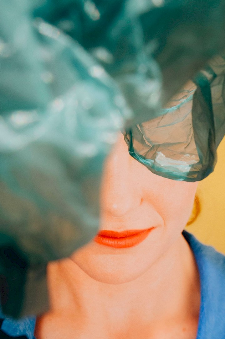 Il s’est agi de re-photographier des portraits de femmes en utilisant l’objet qui est devenu le (triste) symbole de notre époque de consommation de masse : le sac plastique. En plaçant les sacs à l’effigie de diverses grandes enseignes à des distances plus ou moins éloignées de l’objectif de mon appareil photo, ils sont venus former des filtres colorés sur les visages féminins. La consommation et le consumérisme – incarnés par leurs allégories de plastique — apparaissent ainsi dans (C2H4)ⁿ * tant comme des éléments prenant pleinement part à la construction de la beauté et la féminité et venant colorer et émailler les portraits (comme pourraient le faire un produit de maquillage ou un accessoire) que comme des voiles ou des masques venant cacher en partie l’accès au visage (et à la beauté) des modèles. Le rôle de la consommation s’exprime ainsi de manière binaire et paradoxale, à la fois comme élément prenant pleinement part à la construction de la beauté que comme élément venant former un voile ou une interférence pour y accéder.