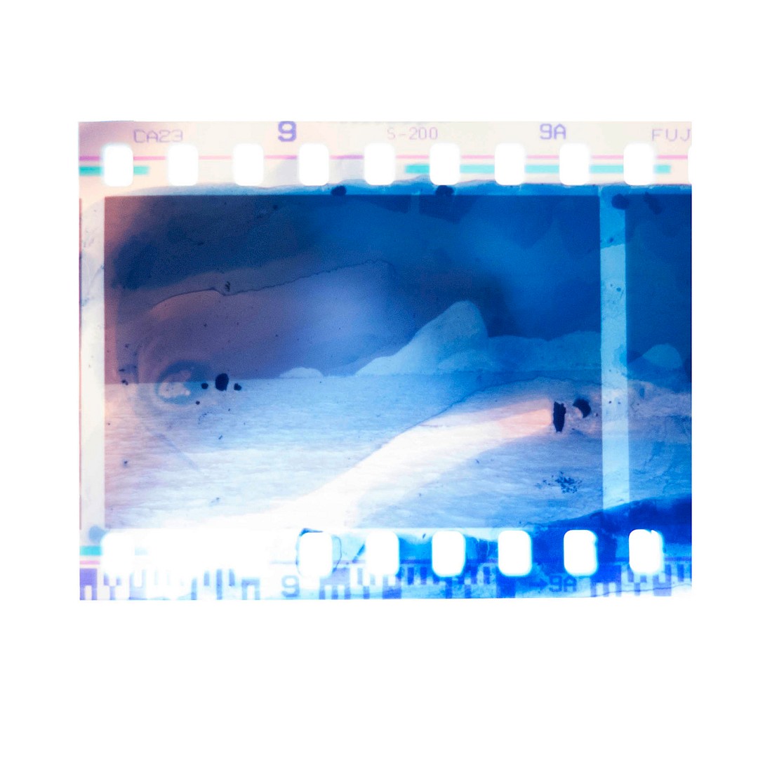 Pour ce travail, une teinture à base de poudre d'indigo a été appliquée sur des négatifs sur lesquels sont exposées des vues du lieu iconique.