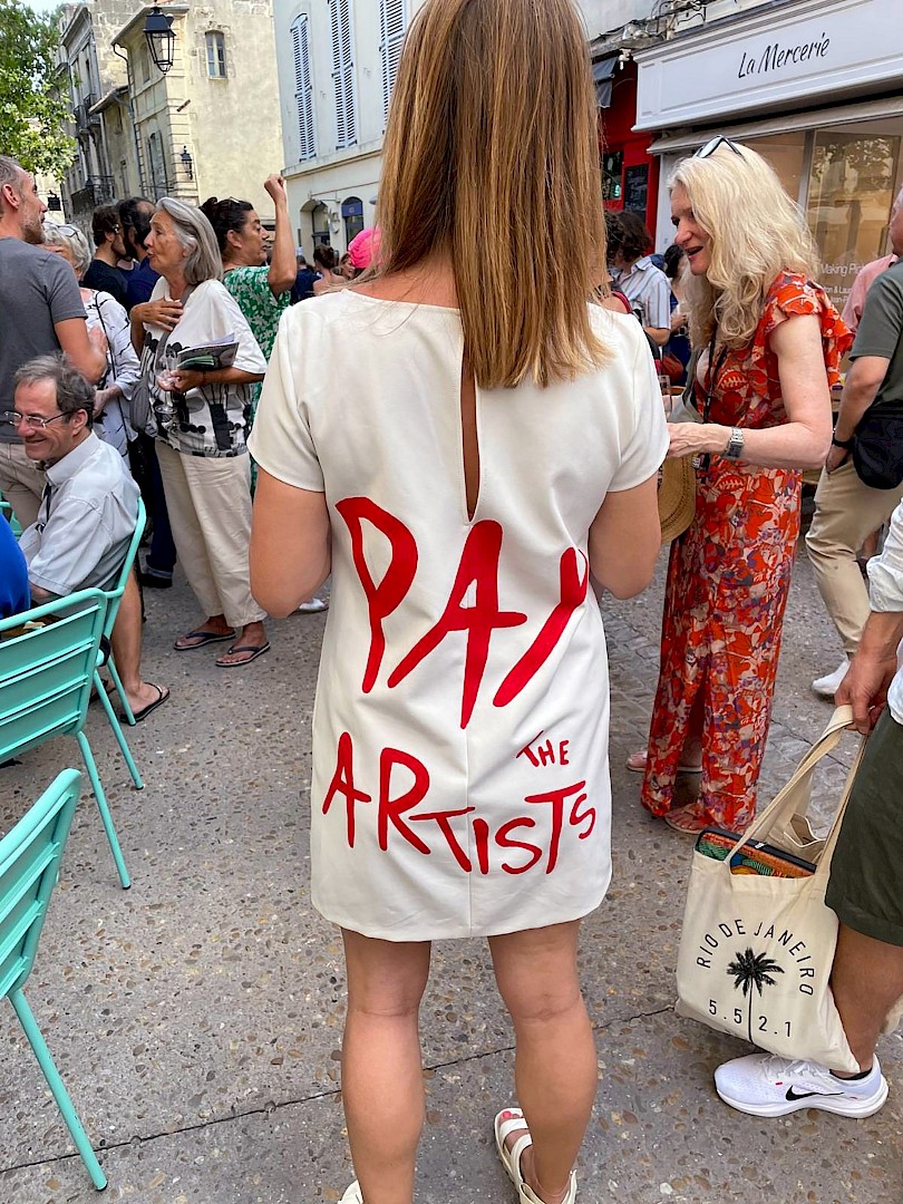 Dans une volonté de visibiliser et faire connaître les conditions de travail des artistes, Elsa Leydier a porté lors de la semaine d’ouverture des Rencontres d’Arles 2023 une robe inspirée de celle d’Alexandria Ocasio Cortes. Elle était estampée du message ‘Pay The Artists’, rappelant le manque de considération, notamment économique, pour la profession d’artiste.