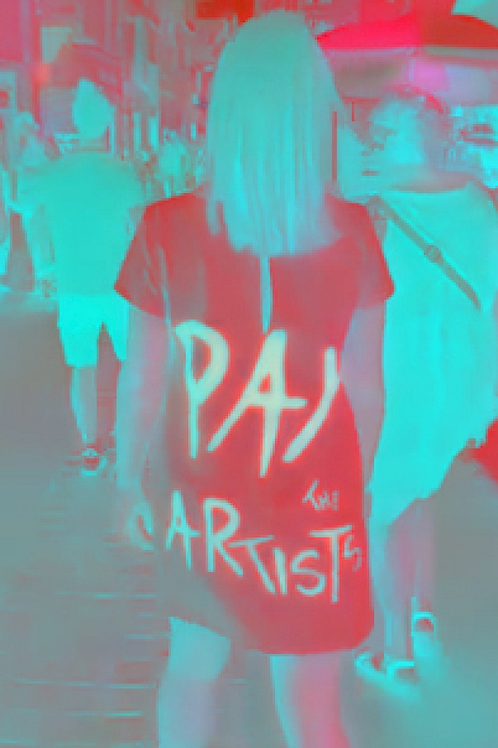 PAY THE ARTISTS est une performance inspirée d’une robe portée par la membre du congrès états-unienne Alexandria Ocasio-Cortez lors du Met Gala 2021. Elle profitait de la visibilité et du prestige de l’événement pour diffuser sur sa robe de soirée un message politique.