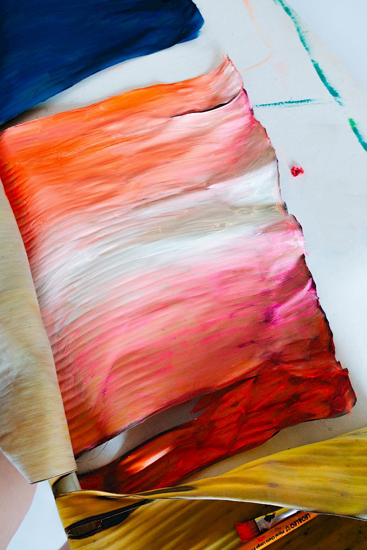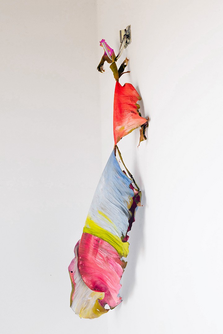 Dans LA HOJARASCA, Elsa Leydier explore notre rapport paradoxal à la nature, entre fascination et destruction. Elle intervient directement sur des feuilles tropicales (palmiers, bananiers, etc.), choisies pour leur forte charge symbolique dans l'imaginaire occidental, en leur appliquant de la peinture. Les végétaux, une fois peints, s'asphyxient et se figent, passant d'éléments vivants à des sculptures fragiles.