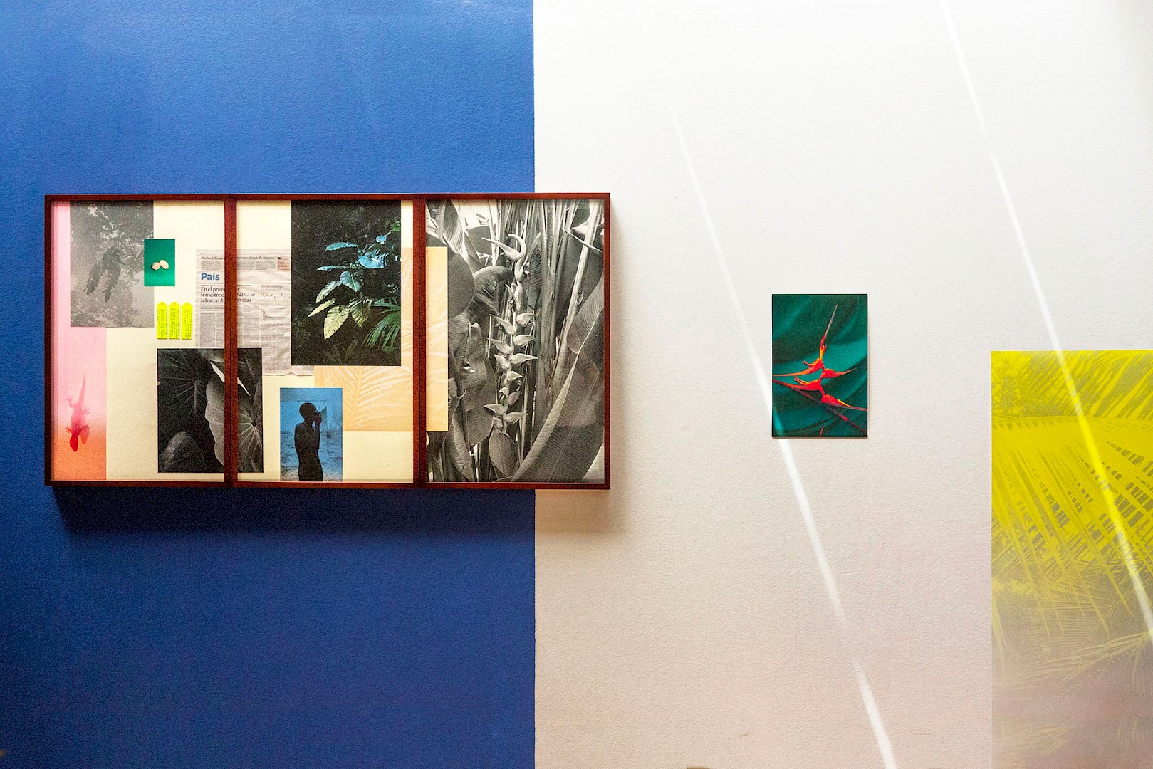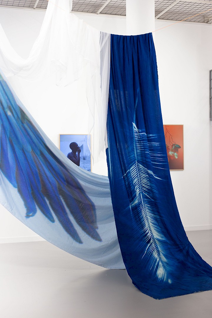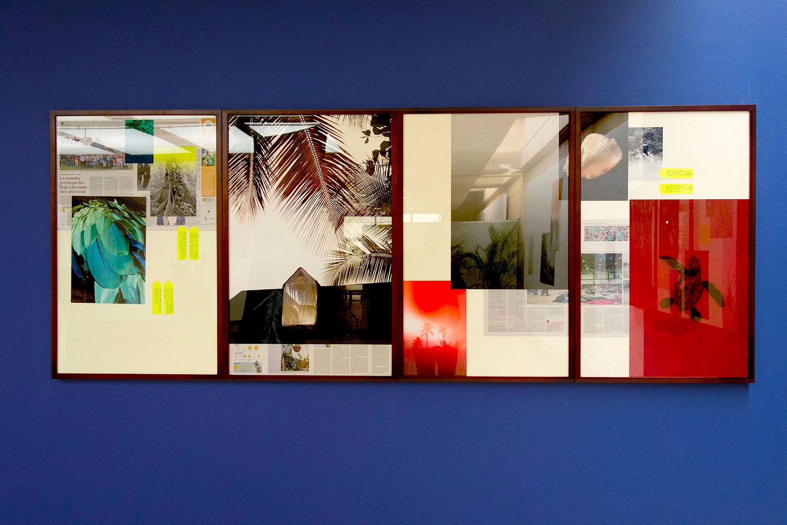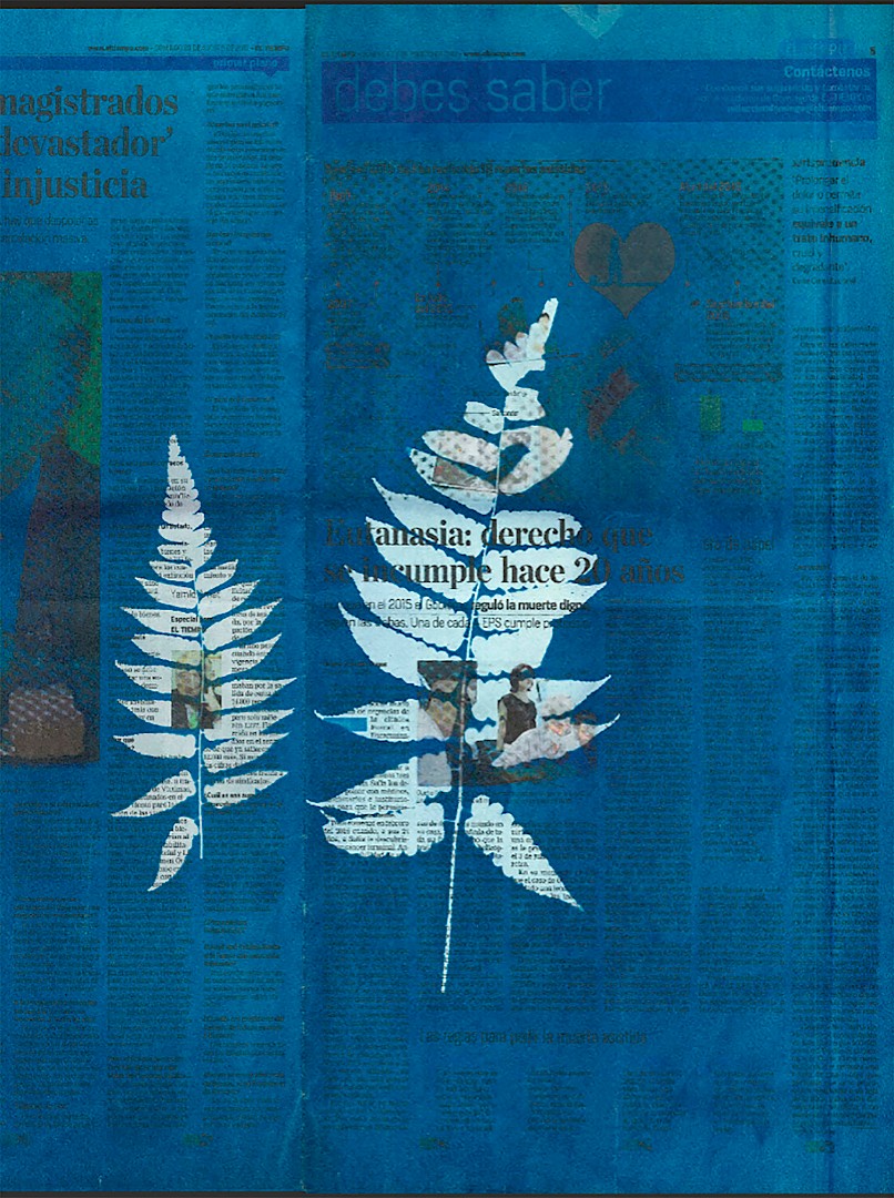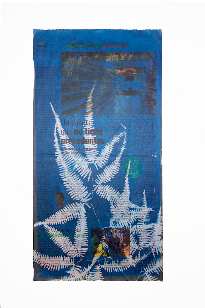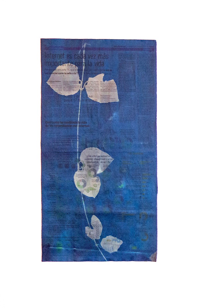 Cyanotypes on fabric, cyanotypes on newspaper pages, ink-jet prints, collages