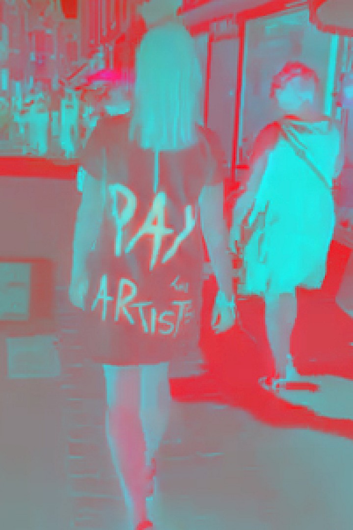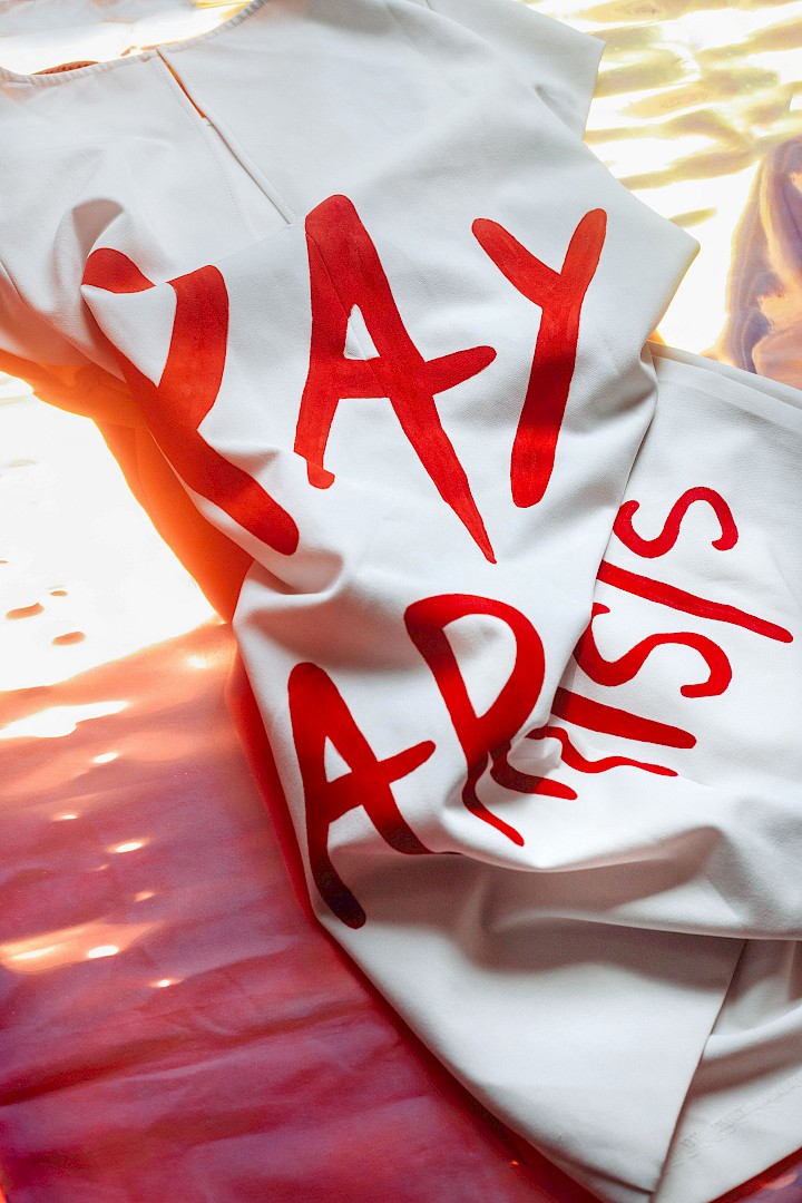 PAY THE ARTISTS est une performance inspirée d’une robe portée par la membre du congrès états-unienne Alexandria Ocasio-Cortez lors du Met Gala 2021. Elle profitait de la visibilité et du prestige de l’événement pour diffuser sur sa robe de soirée un message politique.