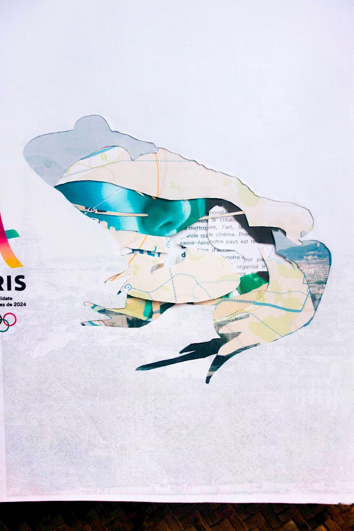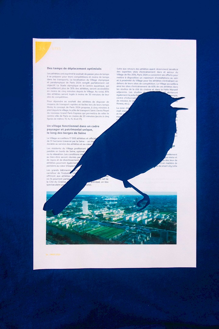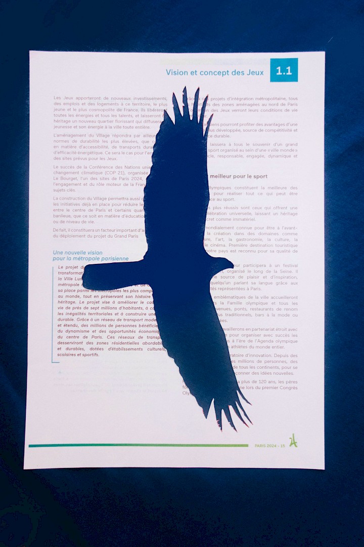 The silhouettes of 44 protected animal species of the park (including the Natterjack toad who would not have made it after the Olympic Games according to a study by ANCA) were cut out from the 266 pages of the application form of Paris 2024.