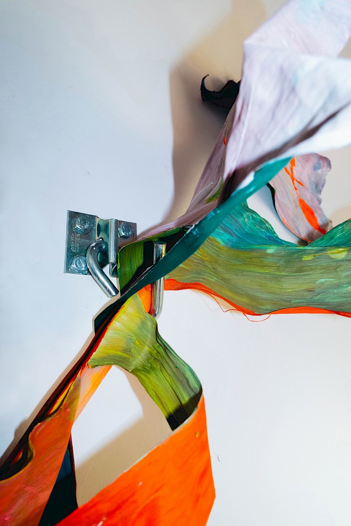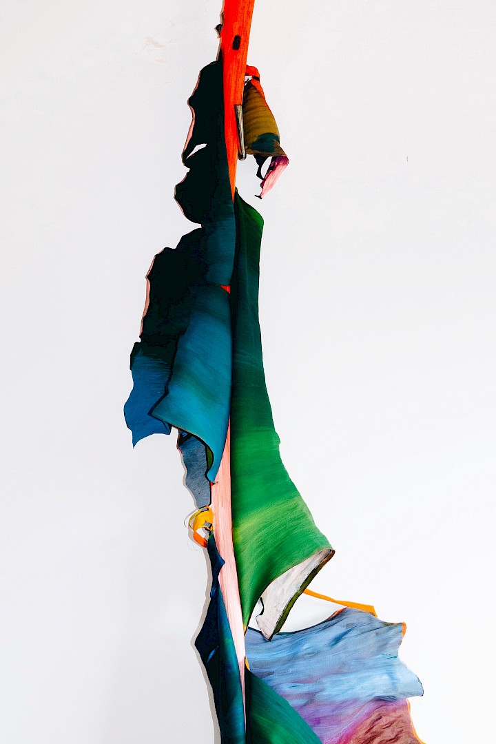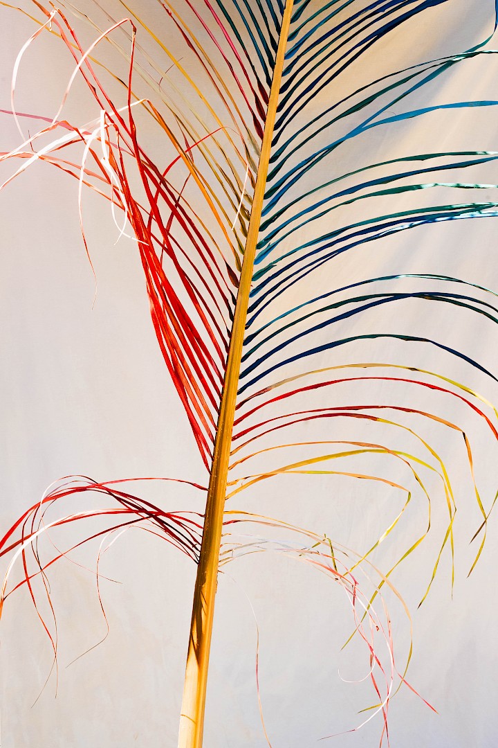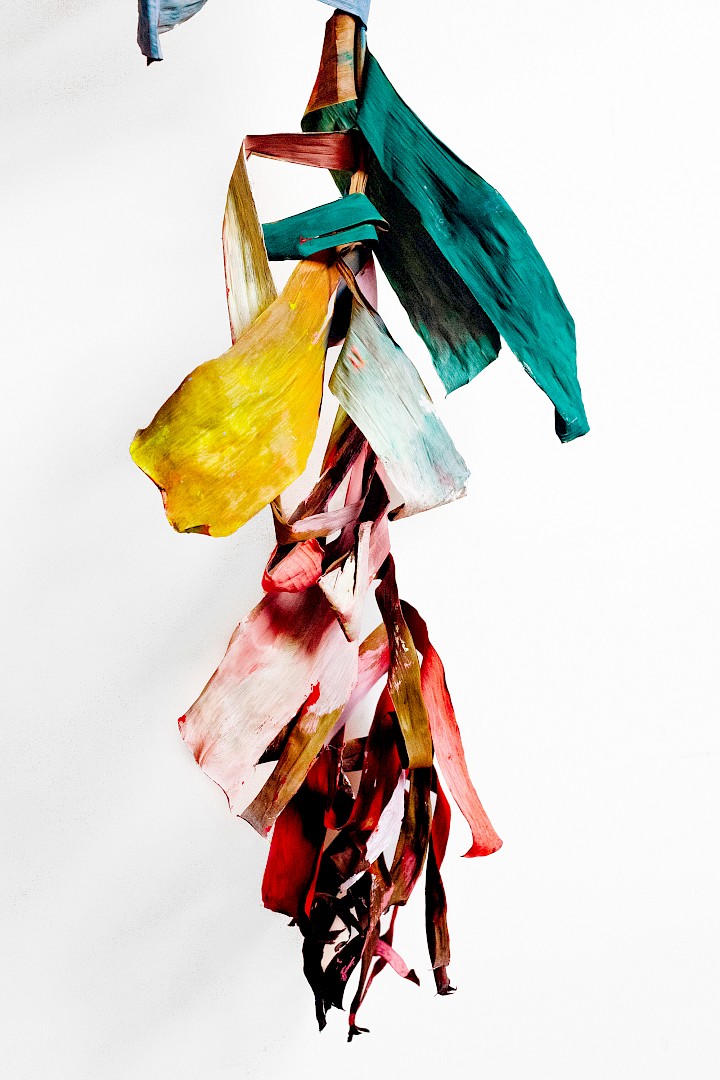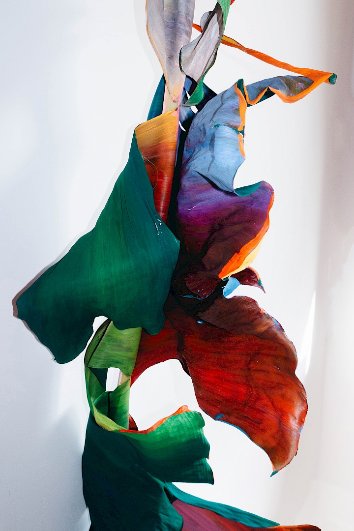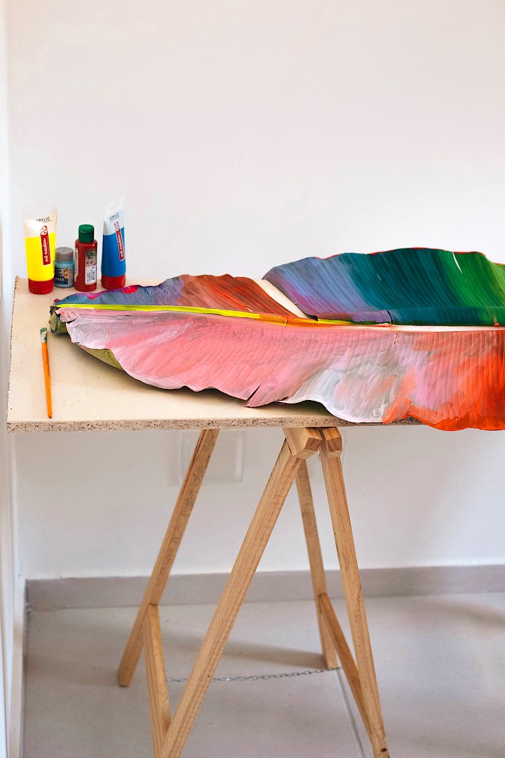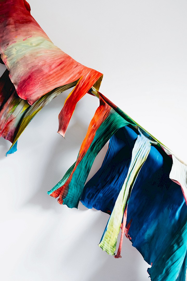 In LA HOJARASCA, Elsa Leydier explores our paradoxical relationship with nature, caught between fascination and destruction. She works directly on tropical leaves (palm trees, banana plants, etc.), chosen for their strong symbolic weight in the Western imagination, coating them with paint. Once painted, the plants suffocate and become frozen, transitioning from living elements into fragile sculptures.