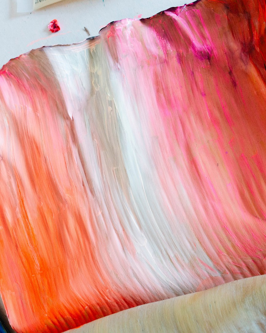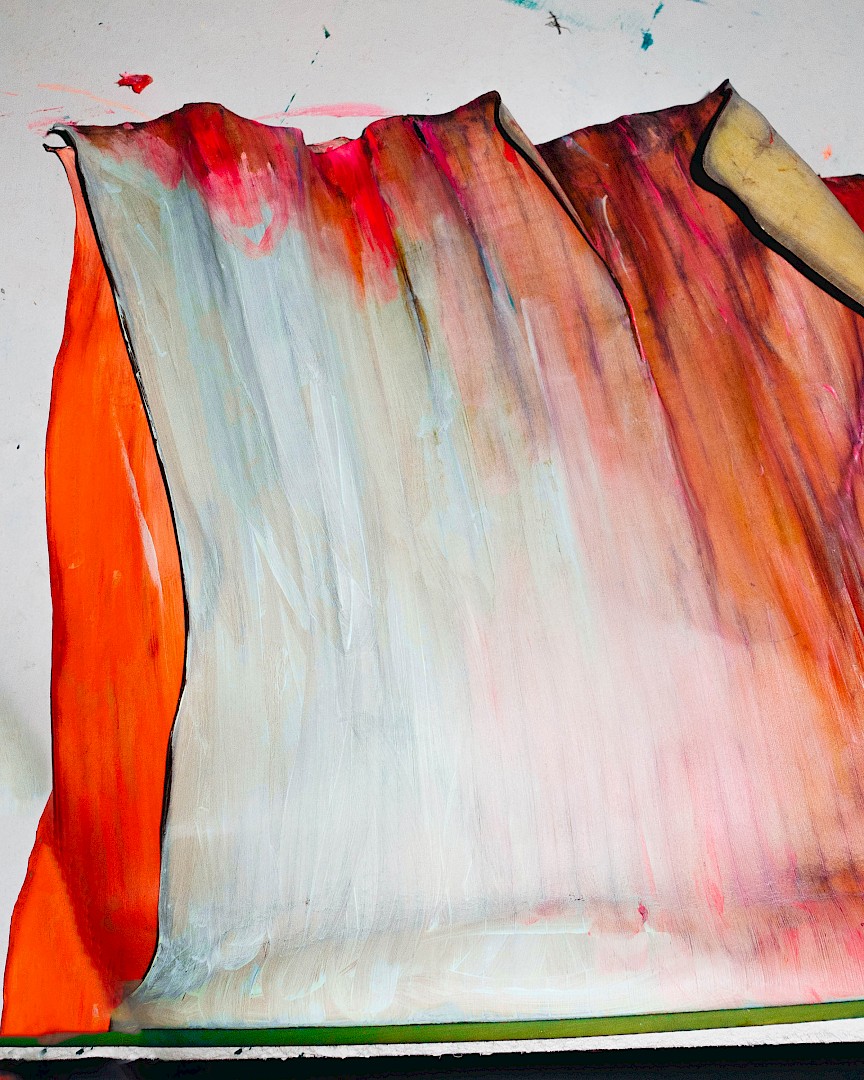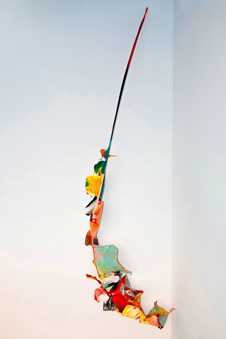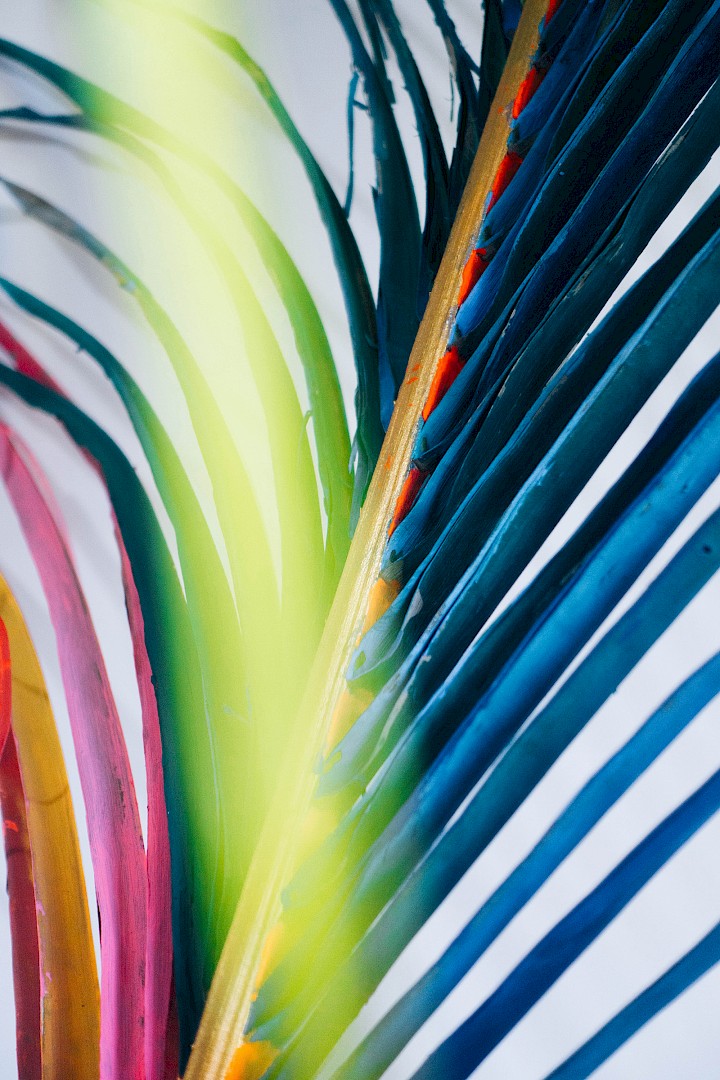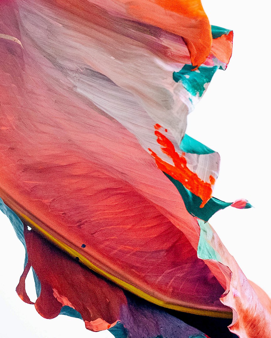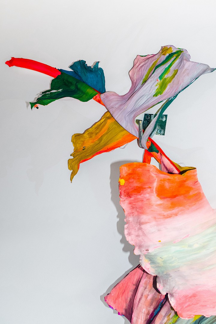 In LA HOJARASCA, Elsa Leydier explores our paradoxical relationship with nature, caught between fascination and destruction. She works directly on tropical leaves (palm trees, banana plants, etc.), chosen for their strong symbolic weight in the Western imagination, coating them with paint. Once painted, the plants suffocate and become frozen, transitioning from living elements into fragile sculptures.