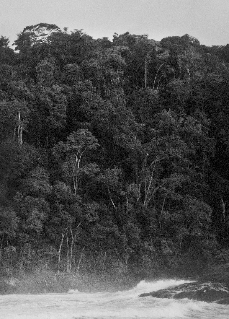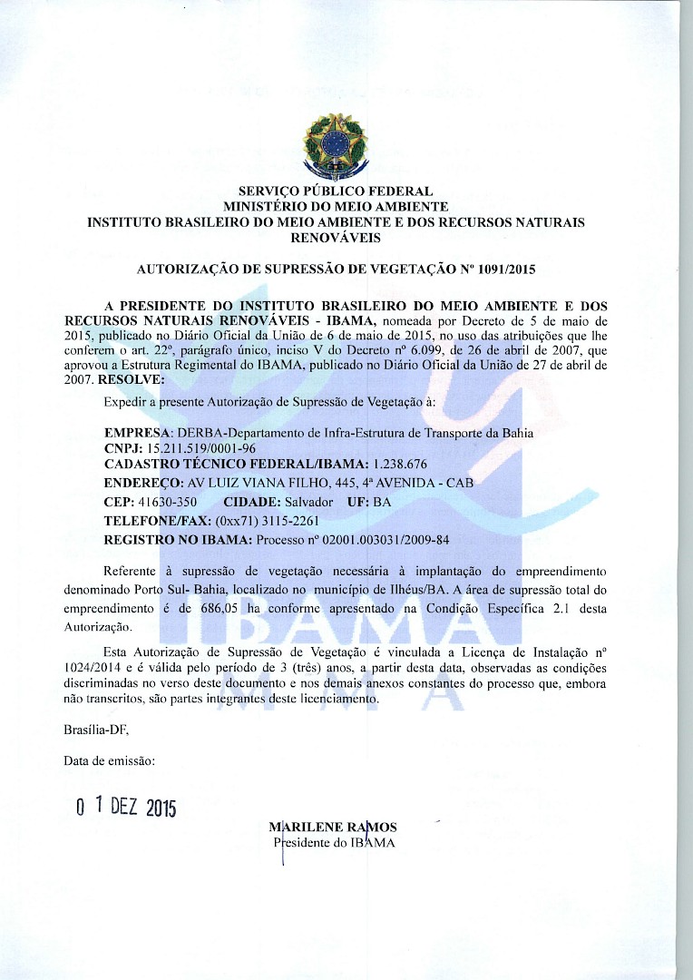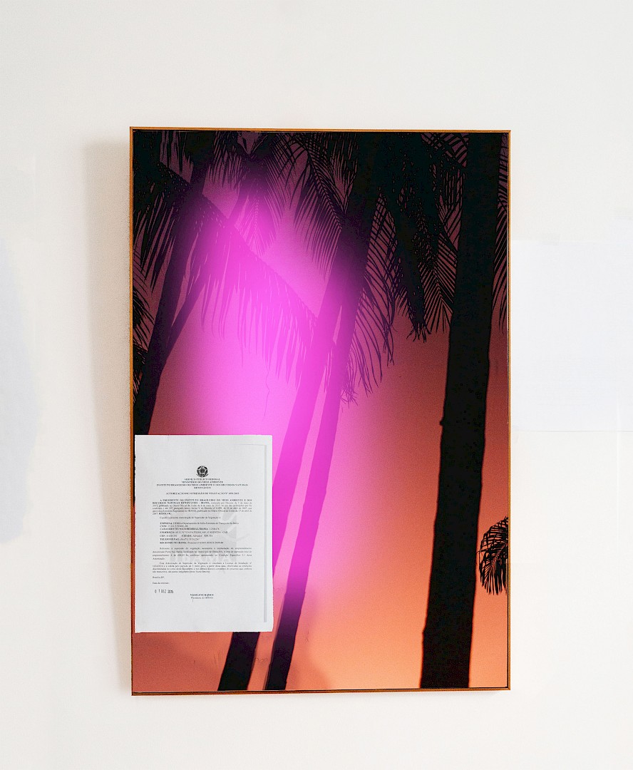 Ici, des pages des arrêtés et autorisations de destruction de la forêt ayant permis le développement du projet Porto Sul sont apposées sur des photographies de la Mata Atlântica et de l'océan. Les très ordinaires feuilles A4 imprimées apparaissent alors comme des anomalies, qui auraient envahi un environnement luxuriant où elles n'ont pas leur place, qu'elles viennent cacher, détruire, annuler.