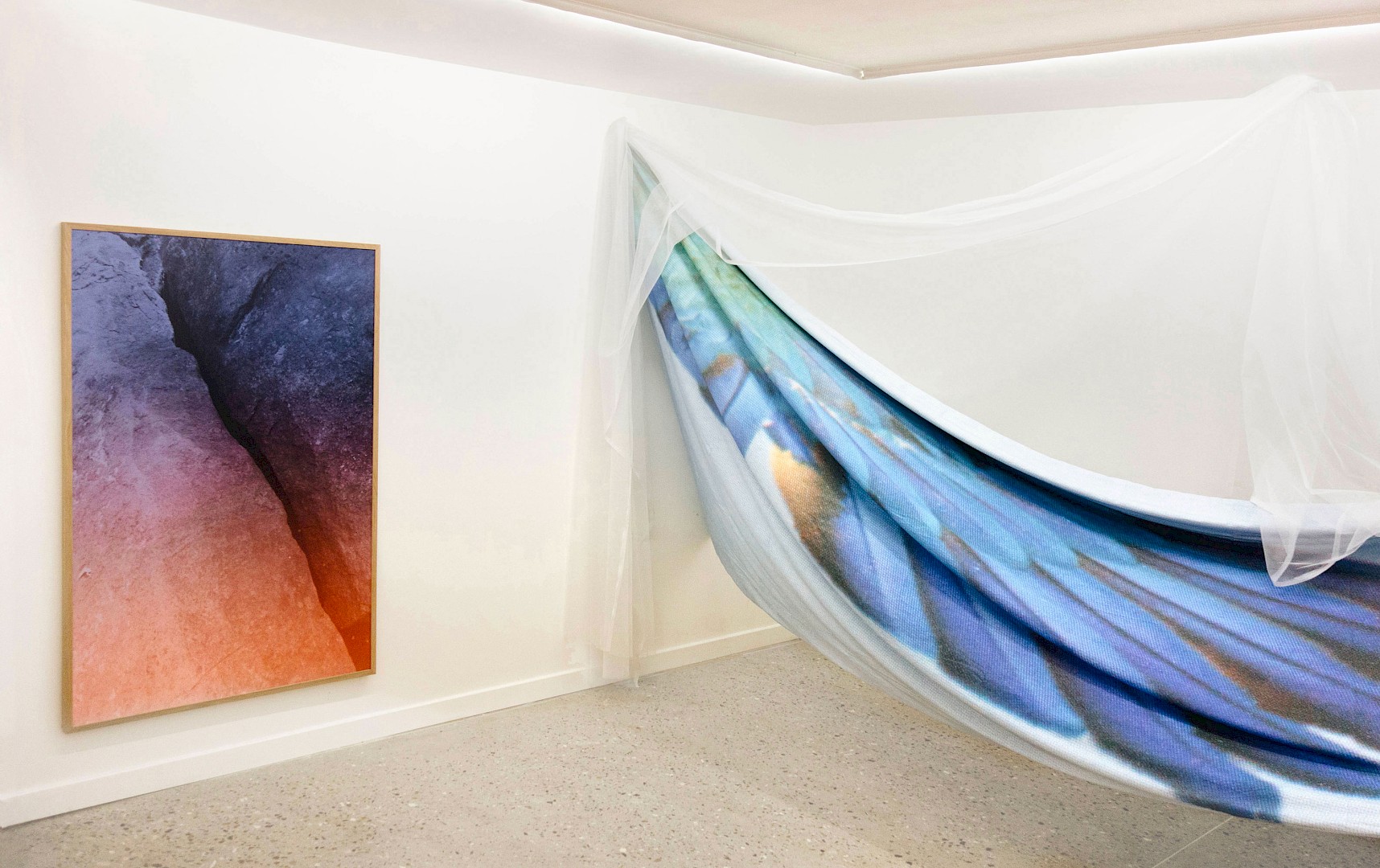 Impressions jet d’encre, installation (impression sur coton sergé, moustiquaire, cordes pour hamac)
